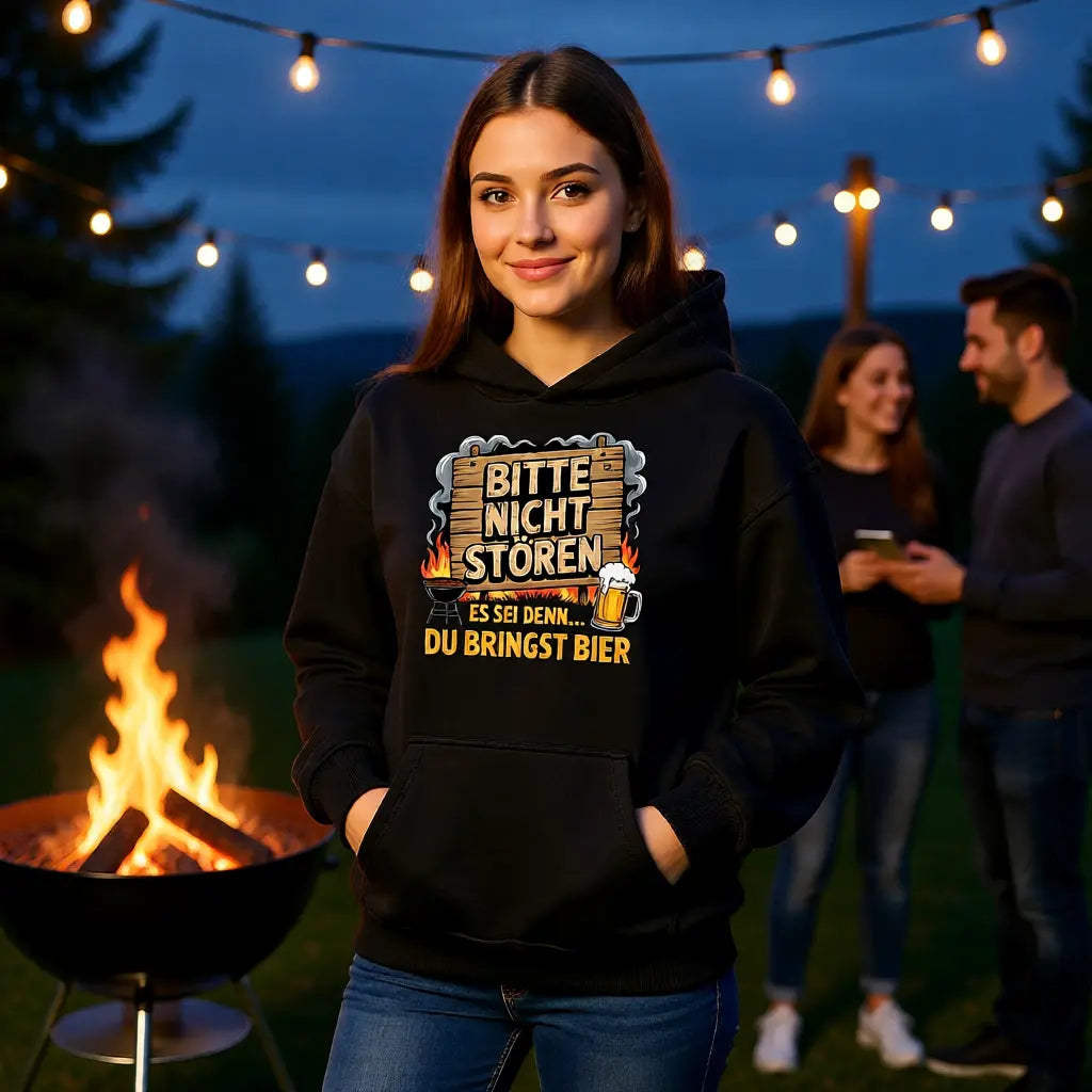 Mach dich bereit für die nächste Grill-Session mit unserem Bitte nicht stören – Bring Bier Oversized Hoodie! Dieser Hoodie ist der perfekte Begleiter für alle, die den BBQ Lifestyle leben und dabei auch noch humorvoll bleiben wollen.