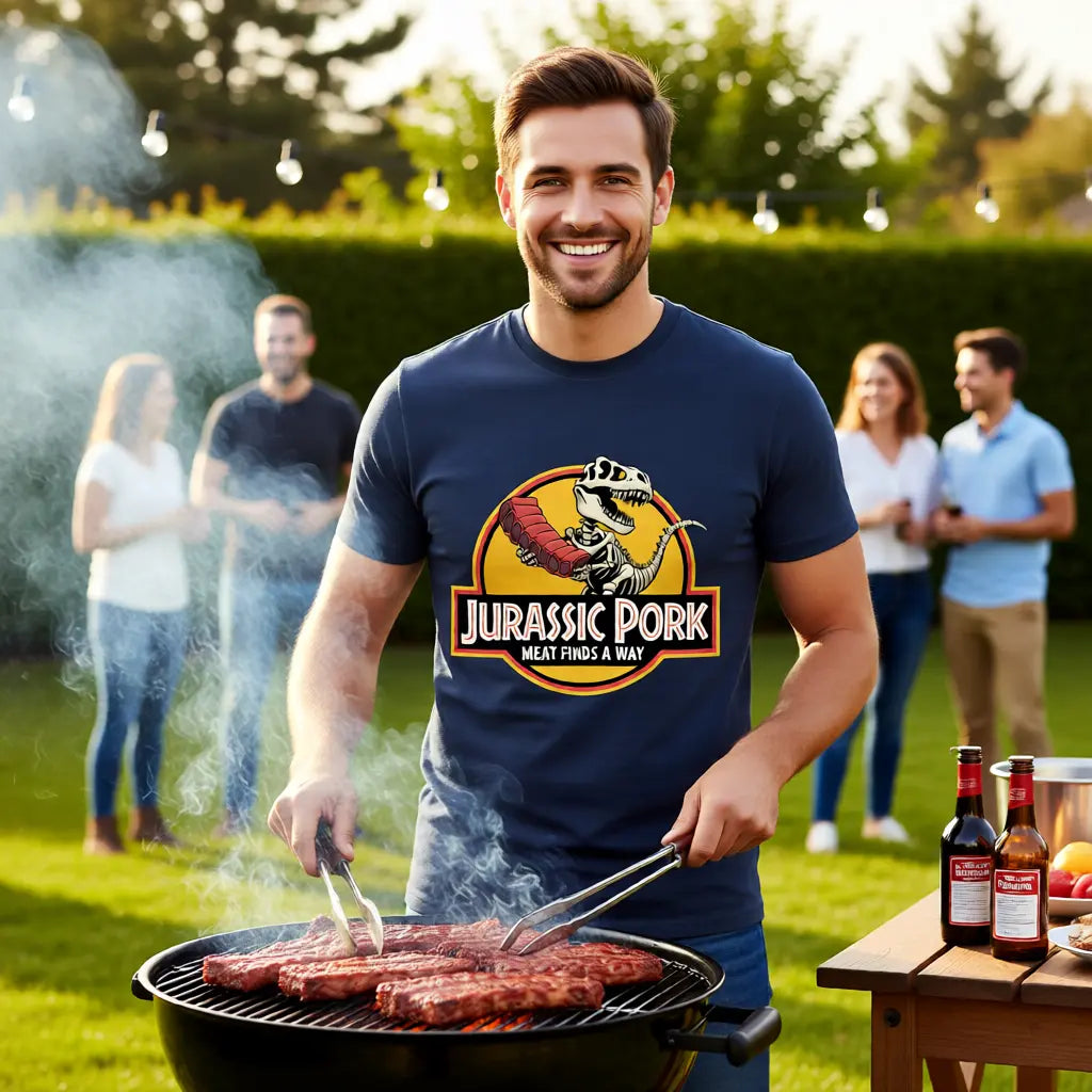 Suchst du nach dem perfekten Shirt für dein nächstes BBQ-Abenteuer? Dann ist unser Jurassic Pork T-Shirt genau das richtige für dich! Mit einem humorvollen Dino-Parodie-Design bringt dieses Shirt den Jurassic Style direkt auf deinen Grillplatz.